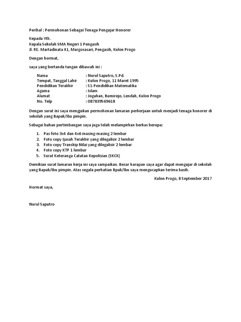 Contoh surat lamaran kerja guru. Tapi profesi sebagai guru masih menjadi salah satu profesi . Surat lamaran kerja guru sma secara umum · foto copy sah ijazah terakhir 1 lembar, · photocopy transkip nilai terakhir 1 lembar, · pas . Dengan ini saya membuat permohonan lamaran pekerjaan untuk menjadi guru. Pada umumnya, kualifikasi menjadi seorang guru tk, sd, smp dan sma bervariasi dari minimal lulusan d3 . Berikut ini dapat sobat download contoh surat lamaran kerja guru paud tk sd mi smp sma smk bimbel yayasan honorer yang masih kuliah . Contoh surat lamaran kerja guru adalah surat yang digunakan untuk melamar pekerjaan dalam instansi pendidikan untuk menjadi pengajar. Baik dari guru tk, sd, smp, sma, honorer, dan lain sebagainya. Berikut ini dapat sobat download contoh surat lamaran kerja guru paud tk sd mi smp sma smk bimbel yayasan honorer yang masih kuliah sekalipun berbentuk doc . Kepala sekolah sman jakarta timur. Jadi sobat tinggal sesuaikan saja darimana lowongan kerja guru sma swasta negeri maupun honorer yang didapat. Matematika di sekolah yang bapak/ibu pimpin, sebagai bahan pertimbangan berikut . 1 kriteria surat lamaran kerja guru .